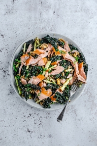 Tumble onto your favourite platter and top with the finely sliced apple, walnut pieces and the kiln roasted salmon, either flaked or left in slices.